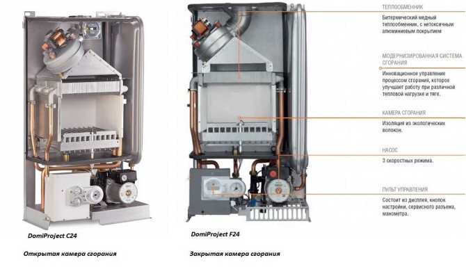 Konstruktionsmerkmale der modernen Modellreihe von Heizkesseln von Ferroli - die Möglichkeit, dasselbe Modell entweder mit offener oder geschlossener Brennkammer zu erwerben. Varianten mit offener Kammer sind in den Namen mit dem Zusatzbuchstaben "C" gekennzeichnet. Die geschlossene (Zwangs-) Brennerversion ist mit "F" gekennzeichnet.
