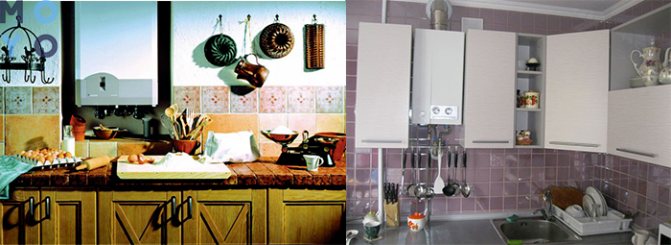 Wenn das Ausblenden einer Säule „in einem Schrank“ nicht möglich ist, ist es sinnvoll, sie zwischen den Gegenständen des Headsets in der Küche zu platzieren. Das Foto zeigt die besten Beispiele für die Maskierung eines Gasheizgeräts auf diese Weise.
