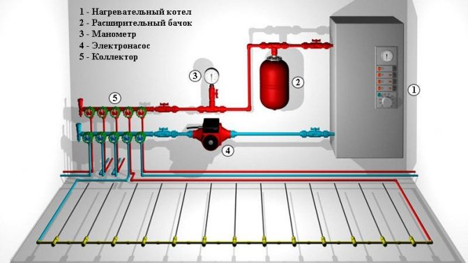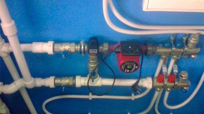 - Anschluss der Umwälzpumpe an die Fußbodenheizung - sie liefert den Durchfluss und den erforderlichen Wasserdruck in der Bodenleitung.