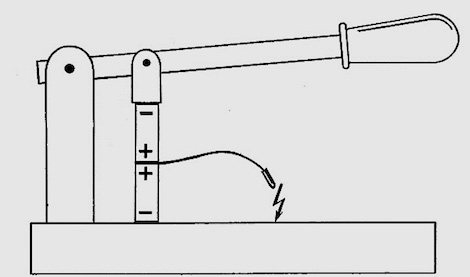 Unter der Wirkung des Hebels werden die Elektroden geschlossen und es besteht eine elektrische Parallelschaltung jedes piezoelektrischen Elements miteinander. Eine Stromleitung mit einer abgerundeten Spitze, die sich in einem bestimmten Abstand von der Metallbasis befindet, wird vom Kontaktpunkt herausgeführt. Wenn Sie den Hebel drücken, bricht ein elektrischer Funke durch den Luftspalt zwischen der Basis und der Spitze. Es ist jetzt klar, wie ein solches Feuerzeug funktioniert. Mit weiterem Druck nimmt die Kraft zu, was zum Auftreten einer zweiten und nachfolgender Funken führt. Dies wird so lange fortgesetzt, bis die piezoelektrischen Elemente vollständig zerstört sind.