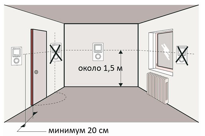 Solche Thermostate sollten in einer Höhe von 1,2 bis 1,5 m über dem Boden und so weit wie möglich von Heizquellen, einschließlich vor direkter Sonneneinstrahlung geschützt, aufgestellt werden.