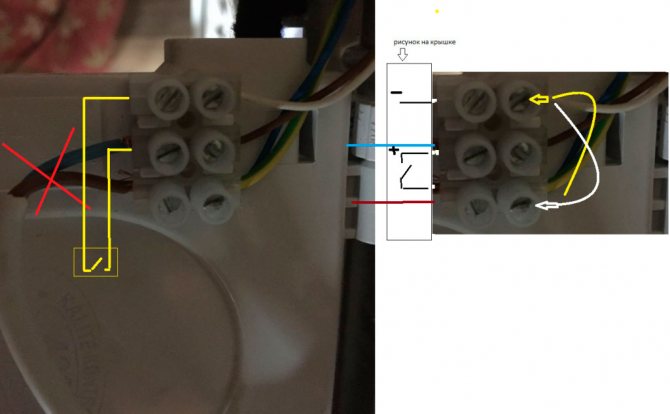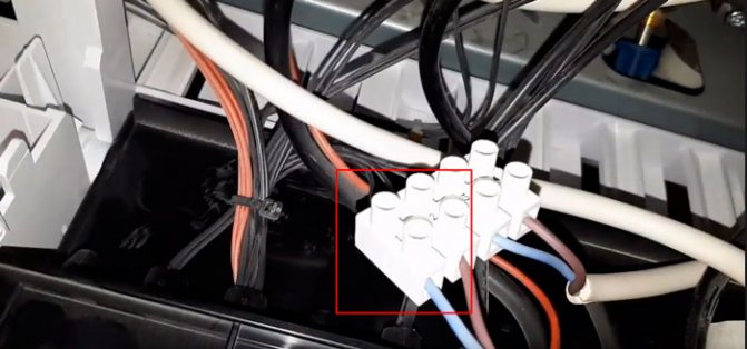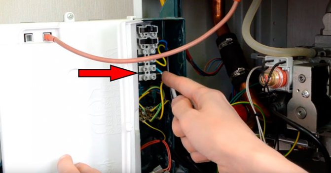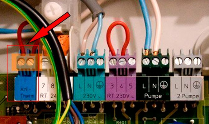 Wir finden diesen Platz im Kessel und entfernen die Werksbrücke, wonach wir die Thermostatkabel anschließen - es ist nichts kompliziertes daran.