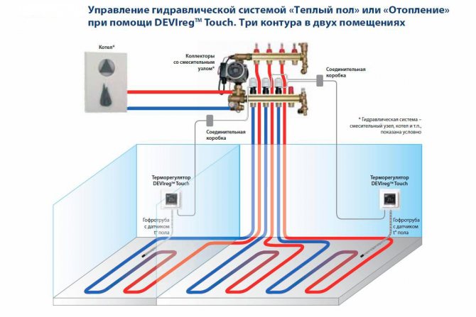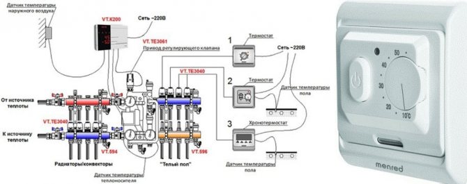 Wenn in einigen Räumen ein wassergeheizter Boden vorhanden ist, der mit demselben Gaskessel betrieben werden kann, wird ein etwas anderer Thermostattyp benötigt. Es muss an die Servos am Verteiler angeschlossen werden.