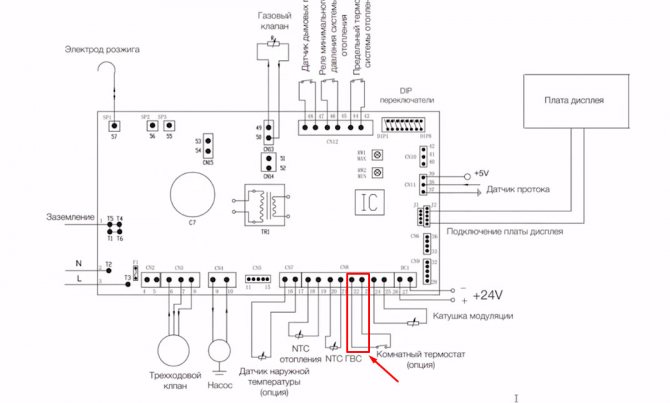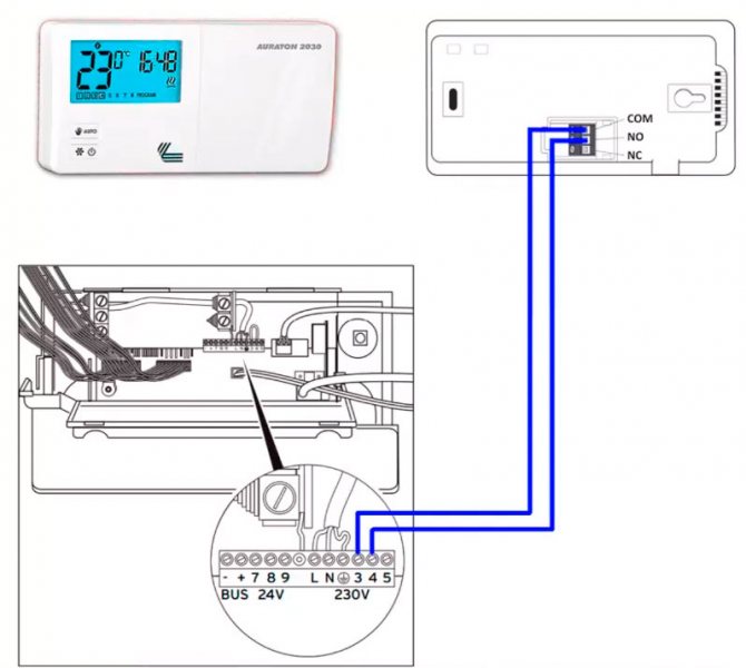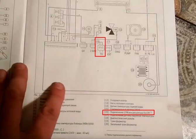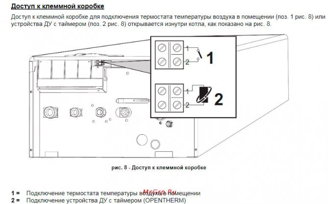 Der Anschlussplan des Thermostats direkt an das Heizgerät ist immer in der technischen Dokumentation zum Gaskessel angegeben. Moderne Geräte aller Hersteller sind mit Anschlusspunkten für ein Thermostat ausgestattet.