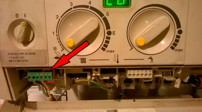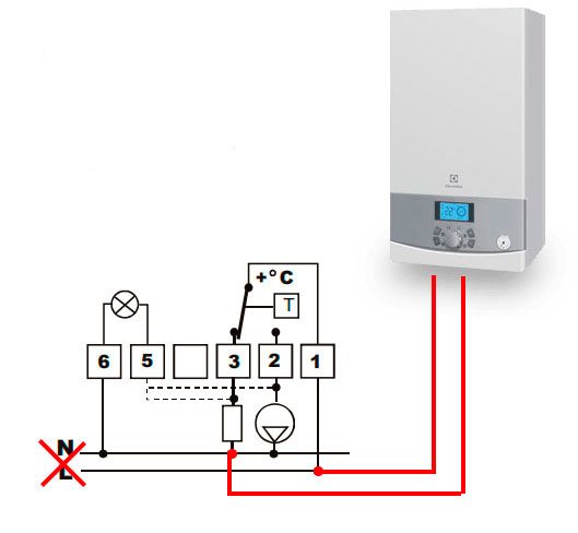Die Spannung von 220 V wird an die Leistungskontakte der Thermostatphase und Null (L und N) angelegt. Dies kann entweder an einem separaten Auslass oder Verteilerkasten oder direkt am Kessel selbst erfolgen.