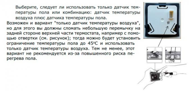 Da dies ein Thermostat für warme Böden ist, funktioniert er höchstwahrscheinlich nach folgendem Schema: Luftsensor + Bodensensor. Dies bedeutet, dass Sie einen Temperaturgrenzwert für einen Bodensensor installieren und einstellen müssen, den Sie nicht haben werden.
