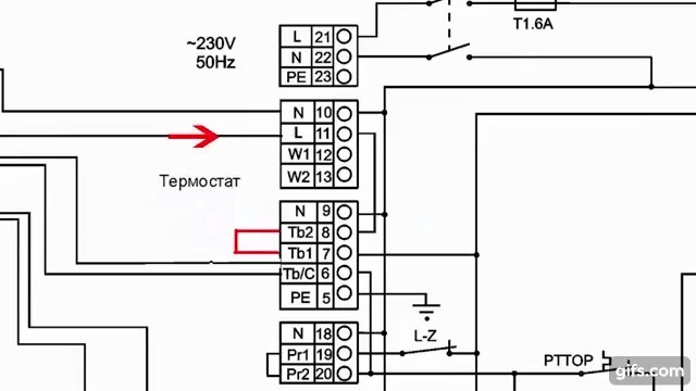 Dazu müssen Sie jedoch die 220-V-Spannung „entkoppeln“. In den meisten Fußbodenheizungsthermostaten kommt es zu den Stromanschlüssen und wird dann von den Anschlüssen entfernt, die zum Heizkabel führen. Und wie oben erwähnt, werden beim Arbeiten mit einem Gaskessel „trockene Kontakte“ verwendet, über die Niederspannungsimpulse übertragen werden.