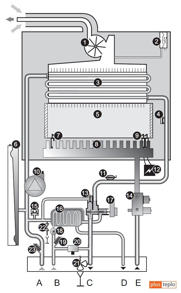 1. Lüfter. 2. Traktionssensor - Manostat. 3. Primärwärmetauscher. 4. Temperatursensor (Notfall). 5. Gasbrennkammer. 6. Ausgleichsbehälter. 7. Elektrode zur Kontrolle der Flammenpräsenz. 8. Brenner. 9. Zündelektrode. 10. Umwälzpumpe. 11. Kühlmitteltemperatursensor. 12. Zündeinheit. 13. Umgehen. 14. Gaseinheit. 15. Wasserdrucksensor im Heizsystem. 16. Warmwasserwärmetauscher. 17. Dreiwegeventil. 18. Warmwasserdurchflusssensor. 19. Warmwasserfilter. 20. Vorrichtung zum Auffüllen von Wasser für das Heizsystem. 21. Sicherheitsventil des Heizungssystems. 22. Wasserablasshahn. 23. Heizfilter.