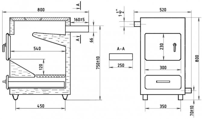 - An der Vorderseite ist eine Tür angebracht, um Kraftstoff in den Feuerraum zu laden, und ein Platz für den Schornstein bleibt zurück.