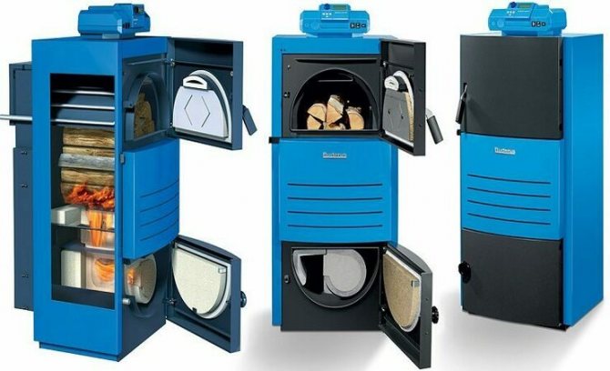 Meistens werden Kessel mit Top-Brand auf Holz betrieben, aber es gibt Modelle, in denen Sie Kohle, Torfbriketts, Späne und andere Brennstoffe stapeln können.