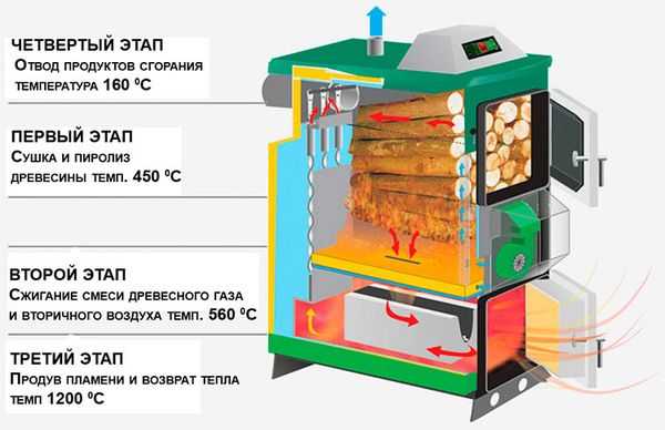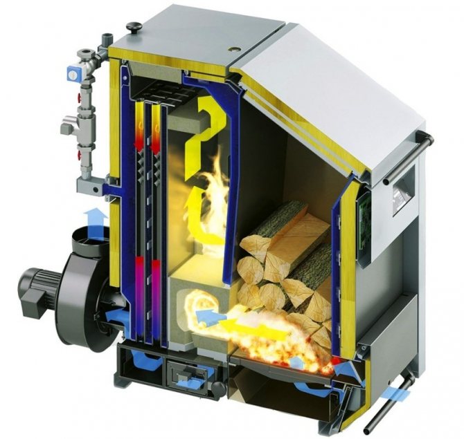 Die Vorrichtung und das Funktionsprinzip eines Holzkessels für den Langzeitbetrieb mit einer Last zielen darauf ab, solche Bedingungen auf engstem Raum in der Brennkammer wiederherzustellen.Brennholz brennt nicht im vollen Sinne des Wortes, sondern schwelt. Die Betriebszeit erhöht sich und der Wärmemangel wird durch das Nachverbrennen der freigesetzten Gase ausgeglichen.