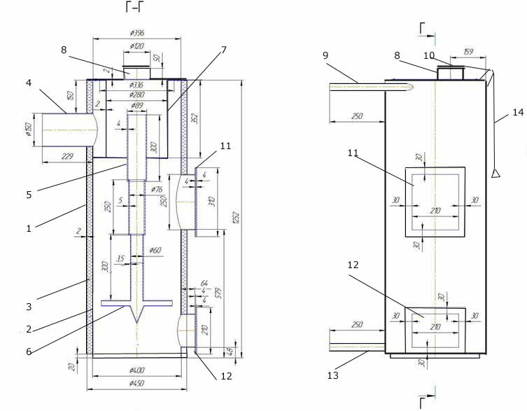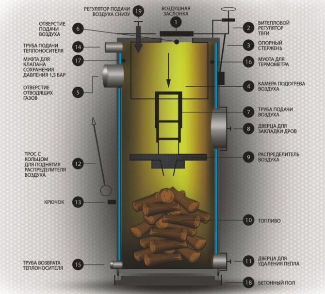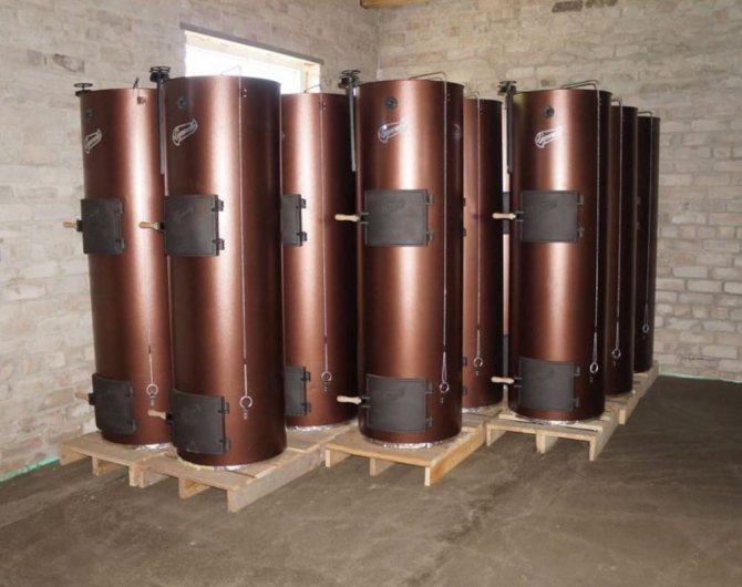 Es gibt auch eine andere Art von Wärmeerzeuger in Form eines Minenkessels. Diese Konstruktion unterscheidet sich von den anderen in der vertikalen Anordnung der großen Ladekammer. Gleichzeitig verbrennt der Brennstoff am Boden der Mine und heiße Luft und Rauch treten durch die zweite Kammer aus, in der sich der Wärmetauscher befindet.
