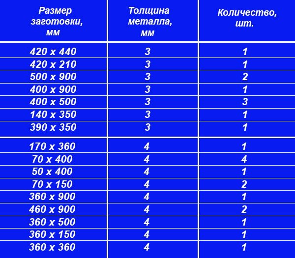 Um das Material zu schneiden, gehen Sie am besten in eine Werkstatt mit Guillotinenschere. Es gibt keine Grate in den Teilen, es wird viel Zeit gespart. Sie benötigen außerdem die folgenden Details: