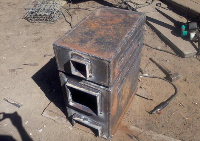 - 4. Schneiden Sie die Türen aus, schweißen Sie zwei Streifen von innen und legen Sie zum Abdichten Asbest dazwischen. Wir schneiden die Roste von 360 × 460 mm aus den Ecken und schweißen sie mit einer äußeren Ecke an die Regale.