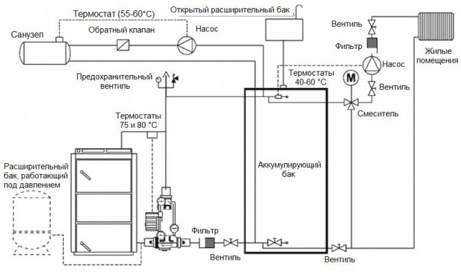 Darüber hinaus muss das Kesselrohrleitungsschema entsprechend der Komplexität des Systems, der Anzahl der Stromkreise und dem Vorhandensein zusätzlicher Geräte ausgewählt werden.