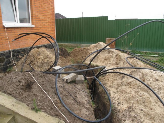 Rohre eines horizontalen Wärmetauschers werden in einer vorbereiteten Grube mit Abmessungen verlegt, die der erforderlichen Oberfläche des Wärmetauschers entsprechen. Sie werden in Form einer Spule (Biegungen) über die gesamte Oberfläche der Grube geführt, wobei bestimmte Intervalle zwischen benachbarten Abschnitten eingehalten werden.Die Intervalle sollten unter Berücksichtigung der Bodenart, aus der sich die Fähigkeit zur "Regeneration" (Wärmezufuhr) ergibt, nicht weniger als 0,4 m und nicht mehr als 1,2 m betragen. Je länger die Bodenoberfläche gefroren ist, desto größer sollte das Intervall sein.