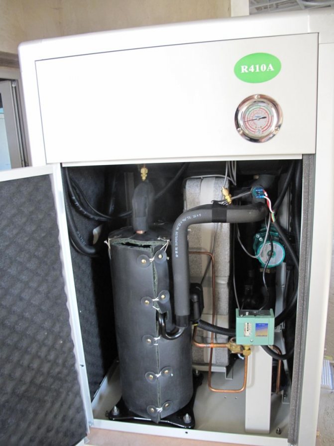 Wir haben ein Kühlmittel, das sich durch die Rohrleitung bewegt, wo es sich tatsächlich um 2-5 Grad erwärmt. Danach tritt das Kühlmittel in den Wärmetauscher (interner Kreislauf) ein, wo es die gesammelte Energie freisetzt. Zu diesem Zeitpunkt befindet sich im externen Kreislauf ein Kältemittel, das einen niedrigen Siedepunkt aufweist. Dementsprechend wird es zu Gas. Beim Eintritt in den Kompressor wird das Gas komprimiert, wodurch seine Temperatur noch höher wird. Dann gelangt das Gas zum Kondensator, wo es seine Wärme verliert und an das Heizsystem abgibt. Das Kältemittel wird flüssig und fließt zurück zum externen Kreislauf.