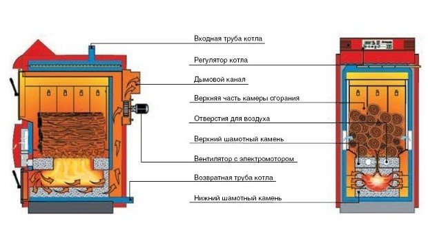 Strukturell besteht es aus einer großen Brennkammer, die etwa 90% des gesamten Kesselvolumens einnimmt. Die Luft wird durch das obere Rohr zugeführt, das durch die Schwerkraft abgesenkt wird, wenn der Kraftstoff verbrennt. Tatsächlich findet ein Schwelprozess statt, aufgrund dessen die Temperatur des Kühlmittels + 70 ° C nicht überschreitet.