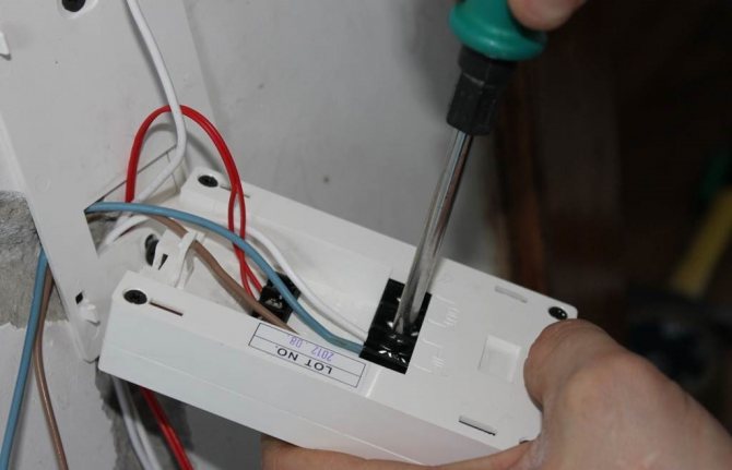 Die Diagnose mit dem Gerät erfolgt nach der Inspektion. Schalten Sie dazu den Thermostat aus, entfernen Sie die Verkleidung von der Vorderseite und dann den Installationsblock. Schließen Sie beide 220-W-Klemmen an den Thermostat an.