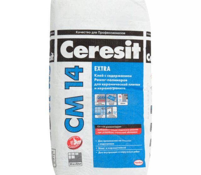 - Ceresit SM-14 Extra. Es wird verwendet, um Porzellansteinzeug auf einen warmen Boden zu legen. Beständig gegen erhöhte Feuchtigkeit. Bietet Haftung auf Beton, Zementoberflächen und Wasserdichtigkeit. Die Arbeiten werden drinnen und draußen durchgeführt.