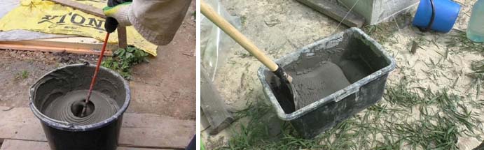 Geeignet für Oberflächen, die hohen Belastungen ausgesetzt sind: Treppen, Terrassen, Rampen, Balkone. Während der Arbeit muss die Oberflächen- und Materialtemperatur mindestens 0 ° C betragen. Windiges Wetter verringert die Aktivität der Klebeeigenschaften, Sie müssen sich schneller bewegen. Unregelmäßigkeiten und Vertiefungen innerhalb von 1,5 cm können mit dem Mörtel selbst ausgeglichen werden. Ein 25-kg-Beutel nimmt etwa 7 Liter Flüssigkeit im Bereich von + 7 ° ... + 20 ° C auf. Das Mischen wird mit einem Bohrer mit einer Düse bei einer Geschwindigkeit von nicht mehr als 600 U / min durchgeführt. Nach dem Mischen 10 Minuten ruhen lassen und den Vorgang wiederholen. Die Arbeitseigenschaften bleiben 120 Minuten lang erhalten. Nach dem Mischen kein Wasser mehr hinzufügen.