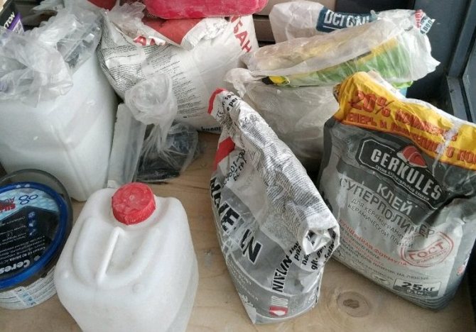 - Schnellhärtende Mehrkomponenten. Es enthält Polyurethan und Epoxidharze. Die beiden Grundbestandteile werden vor der Installation mit Wasser verdünnt. Es verträgt Temperaturänderungen gut.