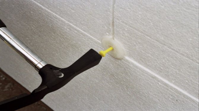 Die Befestigung der Dämmung an einer Holzwand oder Betonoberfläche erfolgt mit speziellen Dübeln, die wie Pilze geformt sind. Dazu werden mehrere Löcher in die Oberfläche gebohrt, an denen ein Stück Schaum befestigt ist. Die erforderliche Tiefe der Löcher muss so berechnet werden, dass sie für eine zuverlässige Fixierung des Materials ausreicht. Diese Löcher sollen die Isolierfolien mit Pilzen verstärken. Nach der vorläufigen Fixierung der Schaumstoffplatte werden die verbleibenden Löcher in der erforderlichen Menge um den gesamten Umfang der angebrachten Wärmedämmung herum fertiggestellt. Der Abstand sollte ca. 25 Zentimeter betragen.