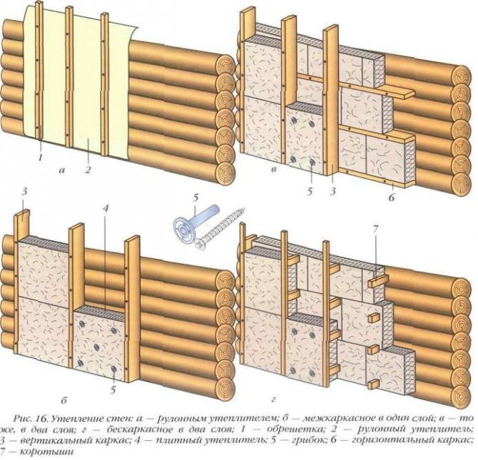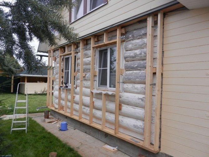 - Ein Rahmen aus Holzprofilen (Metallprofilen) muss in Schritten von mindestens 50 cm an den Holzwänden angebracht werden.Der Abstand zwischen den Trägern bestimmt die Breite der Isolierung - sie muss fest in die Öffnung passen. Der Rahmen wird auf Gebäudeebene errichtet und an Metallecken befestigt.