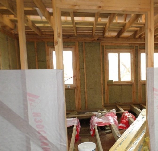 Zwischen den Pfosten befindet sich eine faserige Isolierung. Von der Seite des Raumes ist es mit einer Dampfsperre geschützt. OSB-Platten können als Basis für die Endbearbeitung auf dem Holzrahmen installiert werden. Sie sollten jedoch nicht in der Nähe der Isolierung montiert werden, da sonst verhindert wird, dass Dampf aus der Isolierung entweicht.