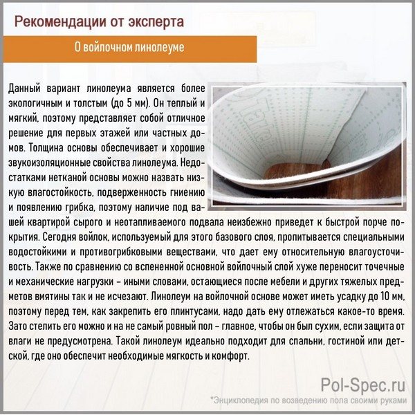 Dickes isoliertes Linoleum kann auf Filzbasis hergestellt werden. Nach Angaben der Hersteller besteht es aus zwei Schichten, von denen die untere aus einem antiseptischen Pad besteht. Die Deckschicht besteht aus einem Polyvinylchloridfilm. Um dieses Material zu verlegen, wird empfohlen, die Basis von Schmutz und Staub zu reinigen. Die raue Oberfläche muss fest und eben sein.