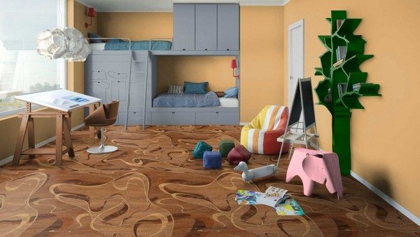 Linoleum kann eine andere Base mit einer komplexen Struktur haben. Gleichzeitig bieten die Hersteller eine breite Palette von Beschichtungen mit verschiedenen Mustern an: geometrisch, abstrakt, thematisch. Ein solches Linoleum zeichnet sich durch seine Elastizität aus, die eine angenehme Bewegung auf der Oberfläche gewährleistet.