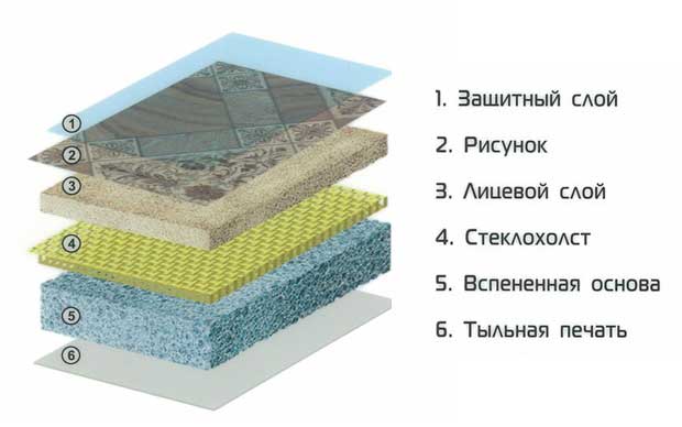 Linoleum mit einer dichten Basis besteht aus 5 Schichten.