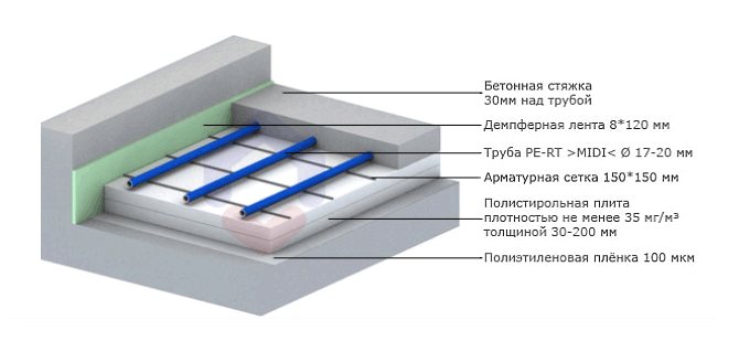 Das Design der Warmwasserbereitung ist nicht so kompliziert, wie es auf den ersten Blick scheint. Die Rohre werden unter dem Boden auf einem Betonsockel in einem Zementestrich verlegt.Heißes Wasser tritt vom Heizkessel in die am Boden verlegten Rohre ein und erwärmt beim Durchgang die Bodenfläche und gelangt dann zur Rücklaufleitung, wo es sich wieder erwärmt. Die Rohre geben Wärme an den Zementestrich ab, der sich von ihnen erwärmt und die Wärme für lange Zeit speichert, wodurch ein weiterer Heizbereich entsteht.