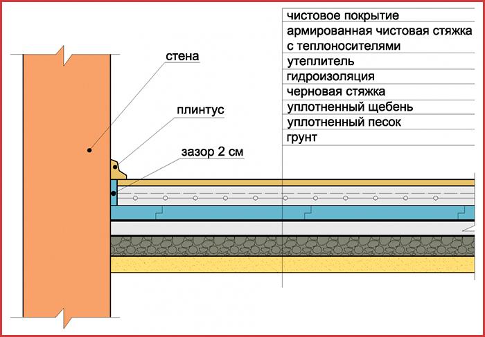 Ein warmer Bodenkuchen ist also eine mehrschichtige Konstruktion für alle Arten von Heizsystemen. Jedes Material wird in einer bestimmten Reihenfolge verlegt und erfüllt bestimmte Funktionen. Die allgemeine Aufgabe des Bodenkuchens umfasst: