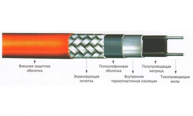 Ein selbstregulierendes Kabel zum Heizen eines Rohrs ähnelt in seiner internen Organisation einem Widerstandsgerät. Es wird auch auf der Basis von zwei Leitern erzeugt, die einen elektrischen Strom durch sich selbst leiten.
