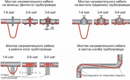 Einzelne Elemente dieser Art (und dazu gehören verschiedene Gewindebohrer, Stützen, Flansche usw.) müssen mit einer großen Menge Heizkabel umwickelt werden, da die Wärmeableitung in solchen Knoten viel größer ist.Alle erforderlichen Installationsschemata finden Sie in der Abbildung unten.