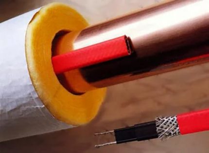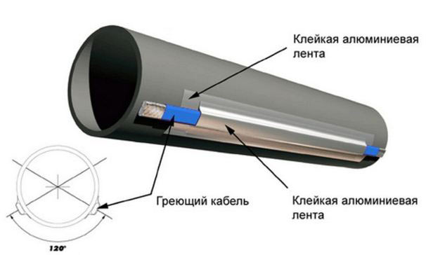 Das am Rohr befestigte Heizkabel ersetzt den wärmeisolierenden "Kokon". Es gibt verschiedene Montagemethoden, die häufigsten sind linear und spiralförmig. Die zweite deckt einen großen Bereich des Rohrs ab