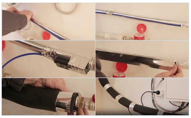 Die Hauptverbindung zwischen der Heizung und der Rohrleitung, bei der der Draht auf die Oberfläche gelegt und mit Klebeband befestigt wird.