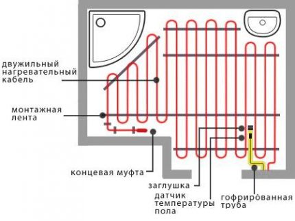 Die Anordnung des Heizkabels im Bad entspricht dem "Warmboden" -System. Der Draht wird mit einer "Schlange" über den gesamten Bereich des Raumes gelegt, so dass sich die beiden Enden in gegenüberliegenden Ecken befinden