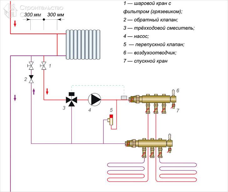 Foto 1. Diagramm zum Anschluss eines wasserbeheizten Fußbodens an das Heizsystem mittels vertikaler Verkabelung.