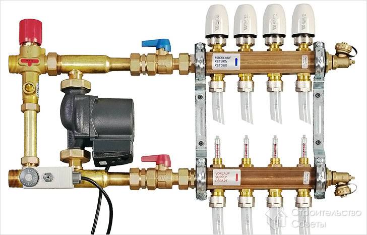 - Packen Sie die Rohre für den direkten und Rückfluss des Heizmediums aus. Die Rohre müssen mit Durchflussmessern und Versorgungsventilen versehen sein. Wenn der Verteiler mehrteilig ist, bauen Sie die Abschnitte zu einer Struktur zusammen.