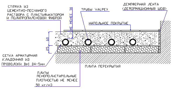 Tatsache ist, dass warme Luft auf Beton nicht streng vertikal nach oben steigt, sondern in einem Winkel von 45 Grad, der einem Kegel ähnelt. Wenn sich die Kanten der Strömungen auf der Oberfläche der Betonschicht schneiden, erwärmt sich der Bodenbelag gleichmäßig und wenn er sich entlang seiner Oberfläche bewegt, ist der Temperaturabfall nicht zu spüren Die Rohre der Fußbodenheizung sind 20 Zentimeter, die Dicke des Betons sollte ebenfalls 20 Zentimeter betragen. Theoretisch schneiden sich die Wärmeströme genau in dieser Höhe. In der Realität reicht es aus, wenn die Dicke des Estrichs geringer ist, nämlich etwa 10 bis 12 Zentimeter, und dafür gibt es mehrere Erklärungen: Ein fertigstellender Bodenbelag wird noch verlegt Auf der Betonschicht, die die Höhe des Bodens erhöht, bilden die im Estrich befindlichen Rohre keine klaren Heizgrenzen, und der Beton erwärmt sich in der Nähe, was zu der gleichen Temperatur an der Oberfläche führt. Installation und Auswahl der Rohre für Ein warmer Boden ist eine vollständig lösbare Aufgabe.