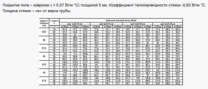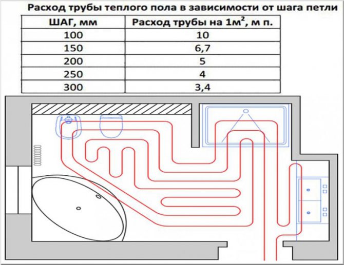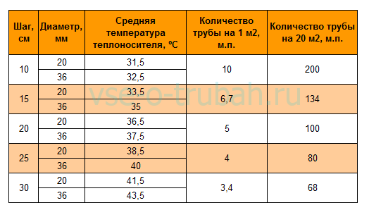 Berechnungen gehen traditionell davon aus, dass 5 m Rohr ausreichen, um 1 m² Boden zu erwärmen (siehe Tabelle oben). Der Nennabstand beträgt 200 mm. Basierend auf diesem Verhältnis können Sie die Nennlänge der gesamten Pipeline berechnen: Multiplizieren Sie die Gesamtfläche des Raums mit 5 und runden Sie auf.
