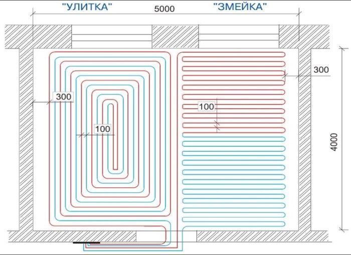 Andernfalls wird diese Methode als Schnecke, Schale oder Spirale bezeichnet. Die Rohrleitungen sind spiralförmig verlegt, um eine gleichmäßige Erwärmung des gesamten Bereichs zu gewährleisten. Es ist so bequem, Rohre in großen Räumen zu platzieren.