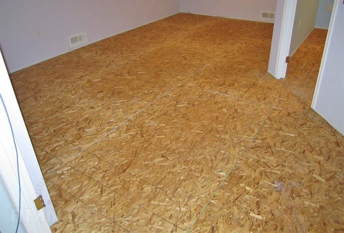 Nachdem alle extrudierten Polypropylenplatten verlegt wurden, fahren Sie mit der Installation von OSB-Holzplatten fort, deren Dicke mindestens 10 mm betragen muss. Es ist zu beachten, dass OSB-Platten speziell für die Bauindustrie entwickelt wurden. In diesem Sinne können sie als Veredelungsmaterial für Dächer, Wände und Böden verwendet werden.