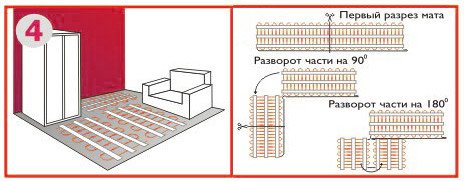 | 1) Es ist erforderlich, einen Plan für das Verlegen dünner Matten im Raum zu erstellen, wobei die Bereiche für stationäre Möbel, Haushaltsgeräte, Sanitärinstallationen, andere Heizgeräte und Einkerbungen von mindestens 10 cm zu berücksichtigen sind. Auch die Einkerbung von Die Wände des Raumes sollten mindestens 5 cm betragen. |