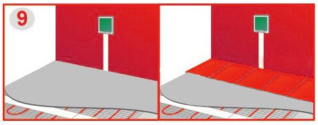 | 11) Füllen Sie einen 3-5 cm dicken Zementsandestrich mit angenehmer Erwärmung und mindestens 5 cm mit der Hauptheizung. Verwenden Sie keine Fußbodenheizung, bis der Estrich vollständig trocken ist. Die Zeit für die vollständige Trocknung hängt von den Eigenschaften und Merkmalen des Gemisches und der Umgebungsluft ab. Es ist ratsam, Zugluft und mögliche Temperaturabfälle auszuschließen. Die Trocknungszeiten werden normalerweise vom Hersteller auf der Mischverpackung angegeben. Die empfohlene Zeit für eine vollständige Trocknung beträgt 28 Tage. |