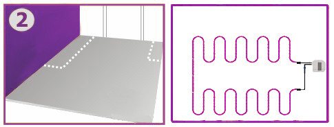 | 6) Verlegen Sie das Kabel und befestigen Sie es auf dem Montageband. Denken Sie daran: Die Ärmel müssen auf dem Boden liegen. Wenn der Abschnitt zweiadrig ist: Verlegen Sie das Ende des Kabels mit dem Befestigungsdraht an der für den Temperaturregler vorbereiteten Stelle, befestigen Sie das andere Ende des Kabels auf dem Boden und beginnen Sie mit dem Verlegen. Wenn der Abschnitt aus einem einadrigen Kabel besteht: Platzieren Sie beide Enden an der für den Temperaturregler vorbereiteten Stelle, befestigen Sie sie und beginnen Sie mit der Verlegung des Kabels. Es ist unmöglich, das Kabel in einem steilen Winkel zu schneiden, aufzubauen oder zu biegen. Halten Sie den berechneten Kabelabstand über den gesamten Heizbereich ein. Der empfohlene Verlegeschritt beträgt 8 bis 15 cm. 7) skizzieren Sie die Anordnung des Abschnitts, die Positionen der Kupplungen und des Temperatursensors. |