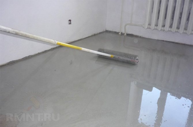 | 2) Es ist notwendig, die Basis des Bodens vorzubereiten, um ihn gleichmäßig zu machen: die Trümmer fegen, Risse reparieren, Schlaglöcher. Es wird empfohlen, den sauberen, ebenen Unterboden mit einer Grundierung zu grundieren. | |