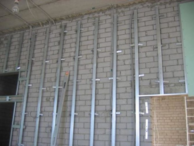 Um eine größere Steifigkeit und Festigkeit der Struktur zu gewährleisten, wird sie mit großen selbstschneidenden Schrauben an den Wänden befestigt. Um die Installation der Isolierung zu erleichtern, sollte die Teilung der Rahmengestelle entsprechend den Abmessungen der Isolierplatten - 600 oder 800 mm - gewählt werden.